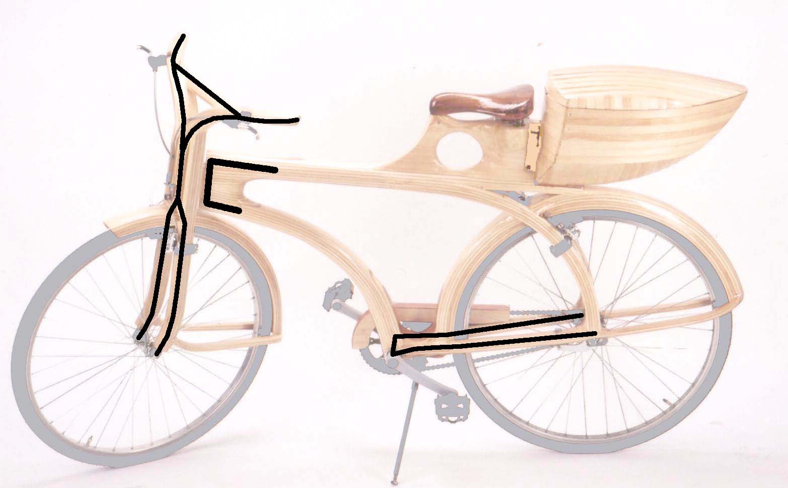 Po izdelavi načrta sem določil dele, ki bi morali biti ojačani z kovinskim jedrom. Vsekakor so to vilice in balanca. Da bi zagotovil večjo togost teh dveh elementov sem se odločil, da ju izdelam v enem kosu. Z okvirjem pa sem ju povezal z takšnim tečajem, kot so ga bicikli nekoč že imeli. Drug ojačan element je spodnji del zadnjih vilic, od pedal do pesta zadnjega kolesa. V les sem oblekel samo kovinske dele, ki sem jih izdelal posebej za ta bicikel. Standardnih delov nisem prekrival z lesom.