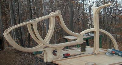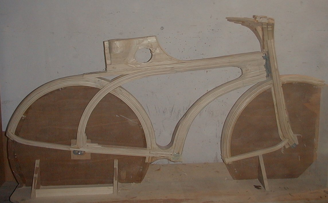 Odločil sem se za laminiranje lesenih letev in furnirja.. Izbral sem smrekove letve (6 x 20 mm) in bukov furnir (0,5 mm). Gradnja pa se ni začela z okvirjem, pač pa z blatniki. V ta namen sem izdelal kalup z dvema kolesoma, na katerega sem na določeni stopnji izdelave namestil kovinske dele. Letve sem po 12 urnem namakanju v vodi krivil na posebnem kalupu, kjer so se sušile 12 ur. Zaradi večje trdnosti sem vsaki plasti letev dodal plast furnirja.