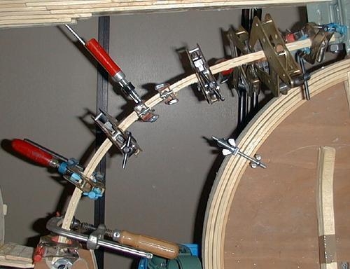 Dolgotrajen postopek lepljenja je trajal celo zimo. Osnovni načrt sem sicer imel, vendar sem nekatere probleme reševal sproti, zato si krivljenih letev nisem izdeloval na zalogo. To je še podaljšalo čas izdelave. Uporabljal sem mizarsko polivinil acetatno lepilo. Malih spon, s katerimi sem si pomagal pri izdelavi laminirane konstrukcije, ni bilo nikoli zadosti.