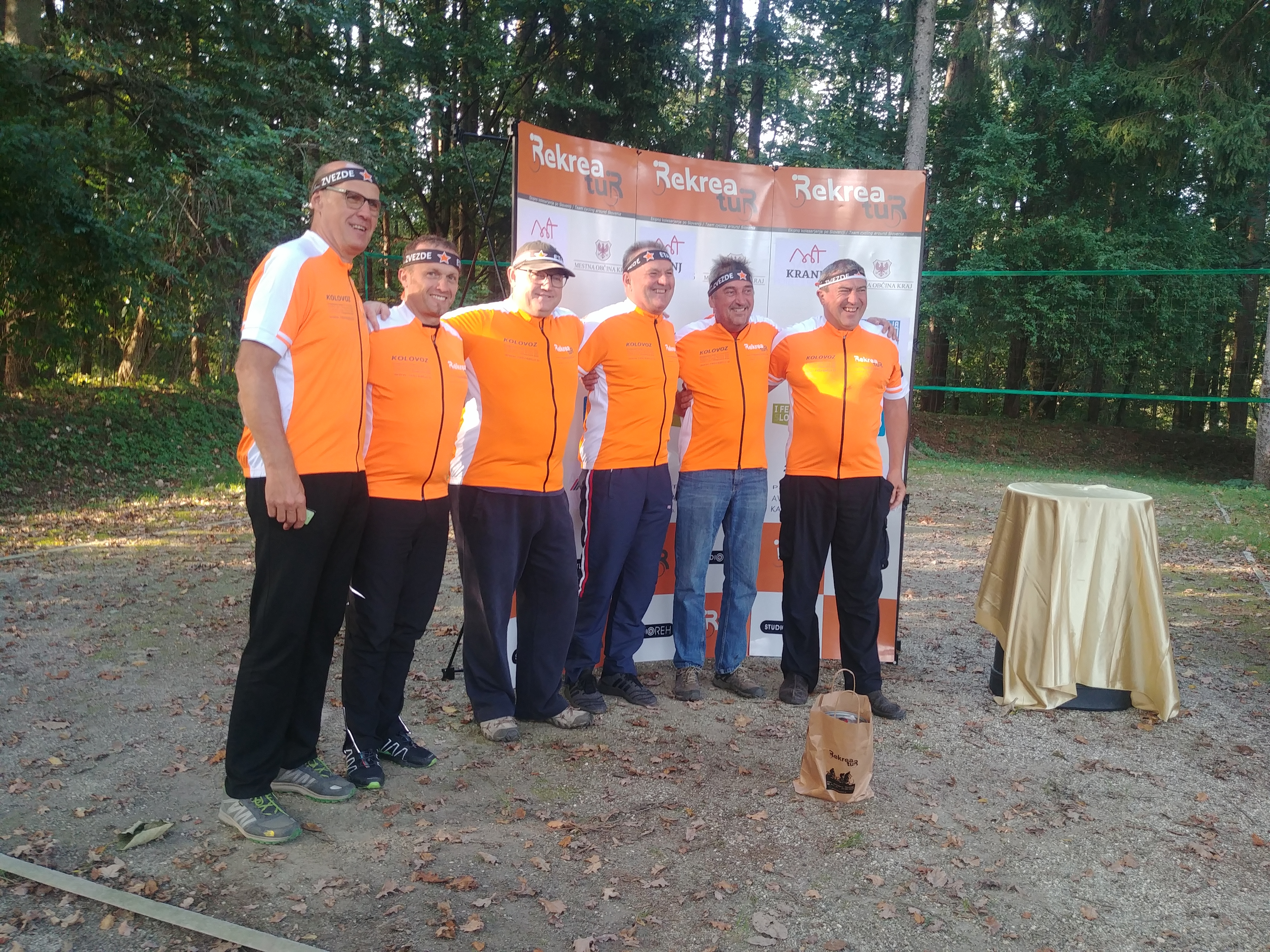 20190930_171549Nerodnost, ki se je Andreju zgodila ob analognem računanju KONČNIH REZULTATOV REKREATURA 2019 ODPRAVLJENA. 30. septembra smo pravi zmagovalni ekipi Kolovoz podelili pošteno prislužene oranžne majice. Najprej jim je vodja Rekreatura, tudi v imenu delovno odsotnega kuharja Borisa, podaril darilo, ki naj bi odtehtalo nerodnost ob razglasitvi rezultatov v Kranju. Čez nekaj časa, ko se je darilo primerno ohladilo, so bili člani z opravičilom zadovoljni. Sledila je skromna slovesnost kjer smo jim nadeli oranžne majice Rekreatura 2019. Pri tem je Andrej omenil velik izziv, ki ga je predstavljala nabava kolesarske majice XXXL. Člani Kolovoza namreč niso med najtanjšimi kolesarji na Rekreaturu. Slovesnost se je nadaljevala z družabnim srečanjem, ki pa se je zavleklo dlje kot je bil tega dne mrak. Z veliko smeha smo obujali spomine na tega in pretekle Rekreature. Ekipa Kolovoz je namreč med njegovimi najbolj zvestimi udeleženci.