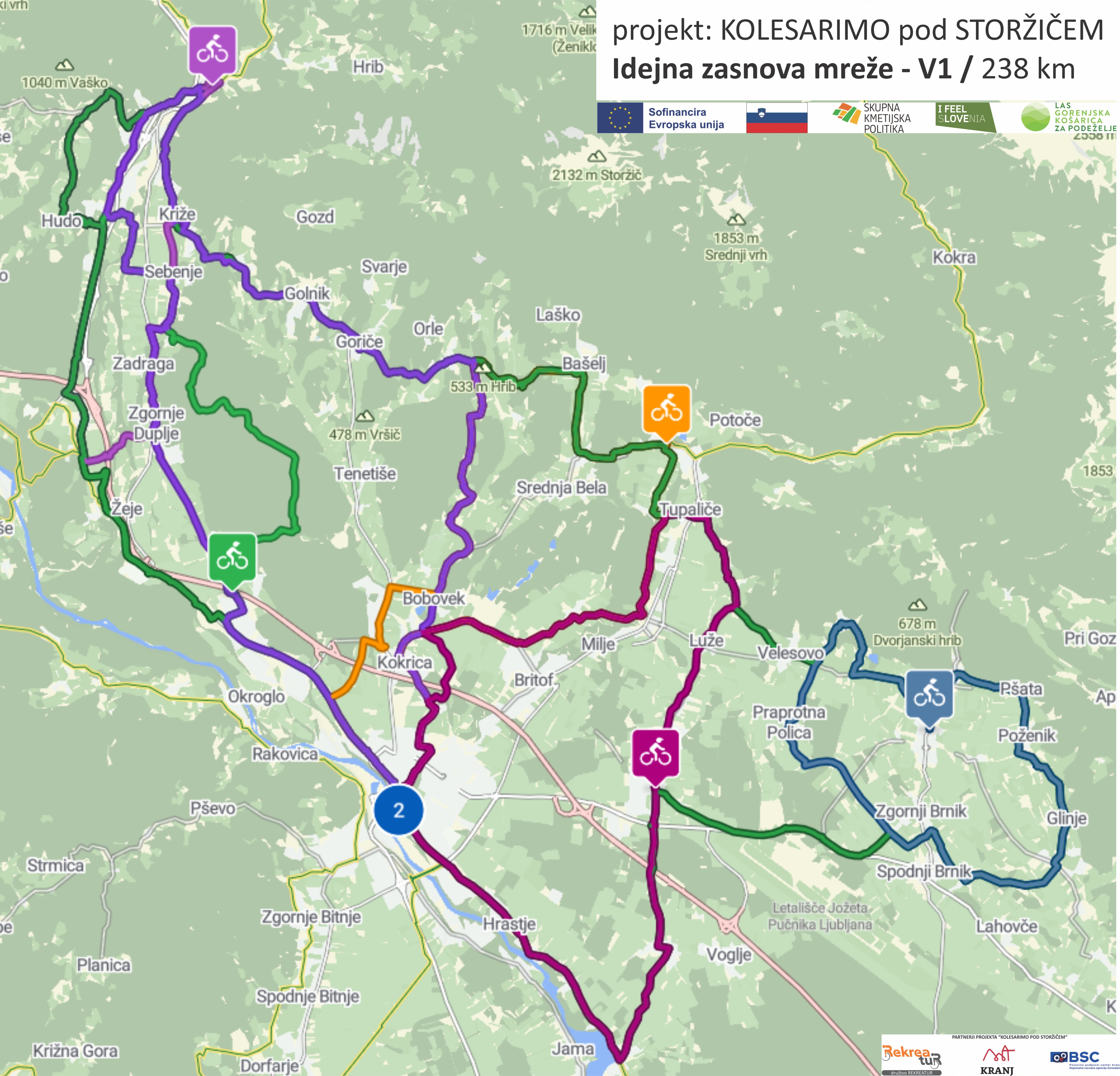 Kratek opis operacije Obstoječi produkt Kolesarske povezave pod Storžičem (KPPS) je, zaradi razvoja kolesarskega turizma, potrebno osvežiti in prilagoditi najnovejšim smernicam. Redefinirati je treba obstoječe partnerstvo štirih občin in ga razširiti še na sosednji. Obstoječe trase KPPS bo treba označiti v skladu z zakonodajo in vanje vključiti zainteresirane ponudnike, kulturne in naravne zanimivosti.